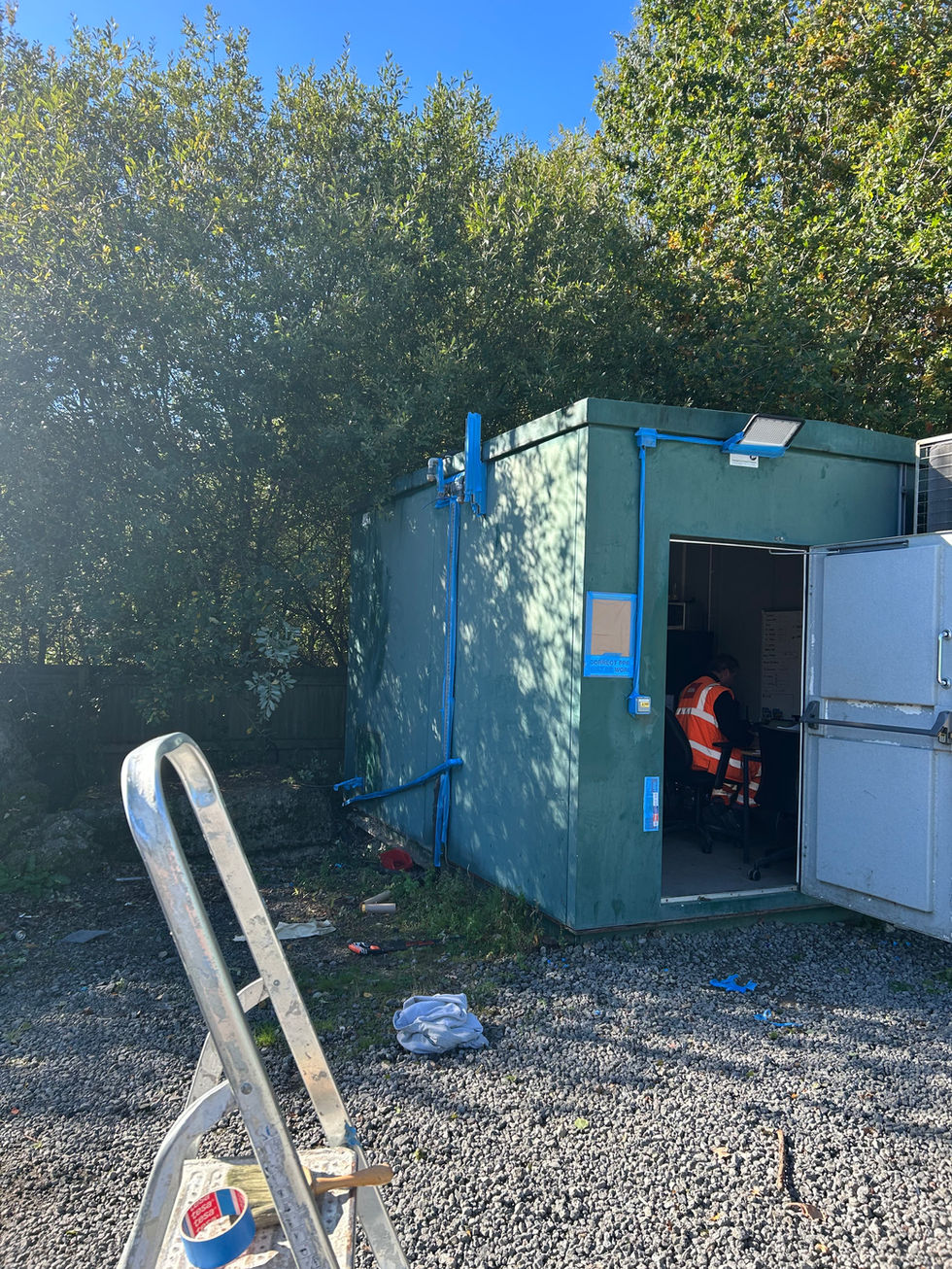 A collection of images showcasing industrial containers, equipment, and utility buildings in various outdoor settings, In this perticular showcase, Gas engines and containers for landfill sites are being re-sprayed.